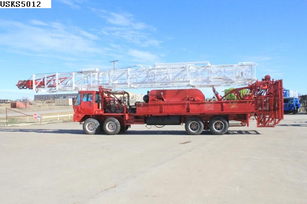 MOOR 500 Well Service Unit p/b DETROIT 60 series Diesel Eng, ALLISON 5610 Trans, 42X10-42X10 DRAWWORKS w/disc assist, 104’ 210,000# Telescoping Mast Hydraulically Raised & SCOPED, Mtd on 5-Axle Carrier w/Sgl-Man Cab, (4) Hyd Leveling Jacks, Hyd Utility Hoist, sand line, tubing line, block, tong rack & Flotation Front Tires
